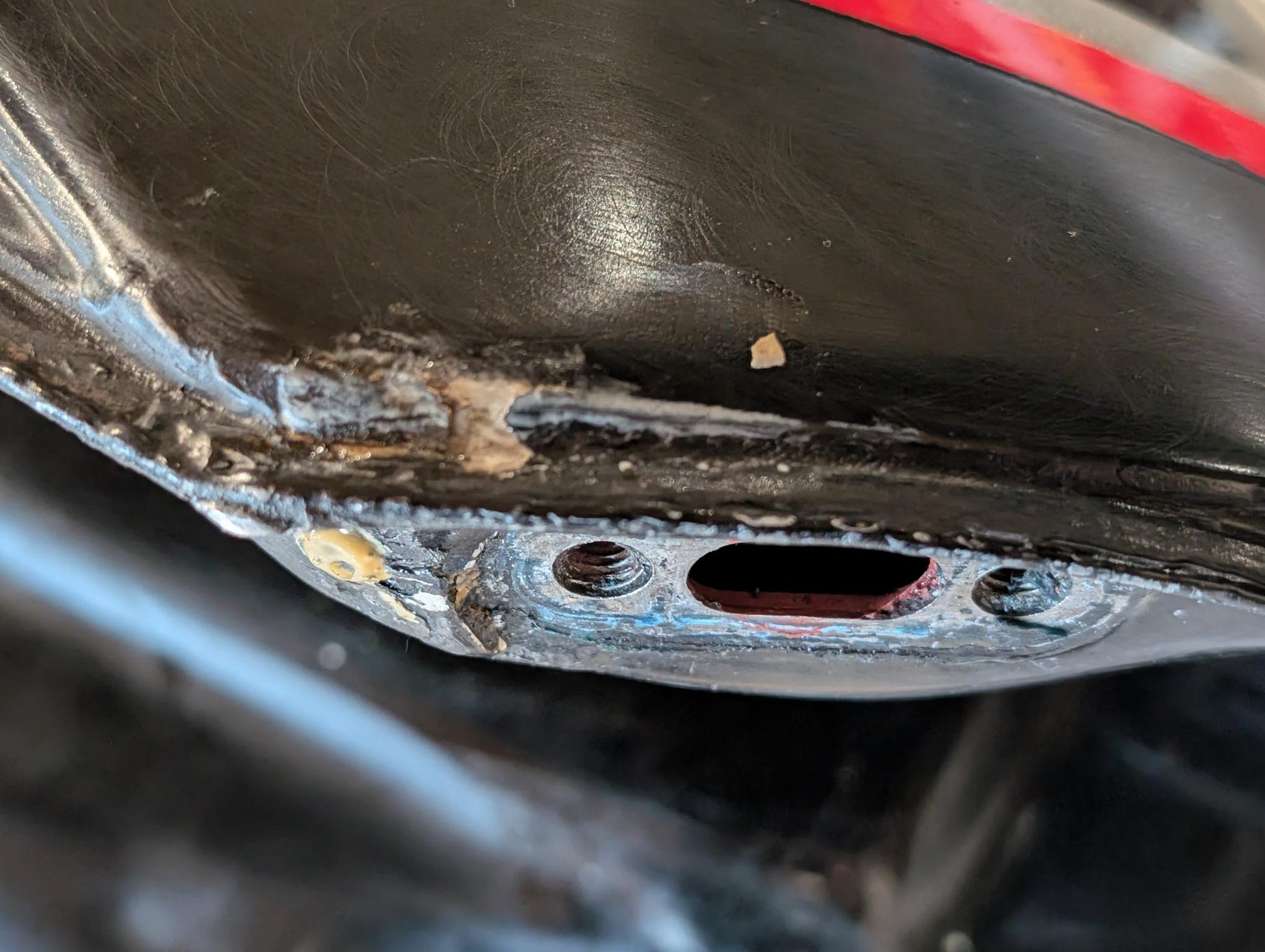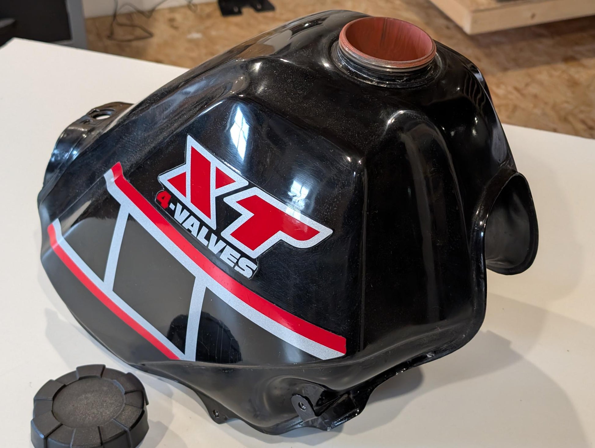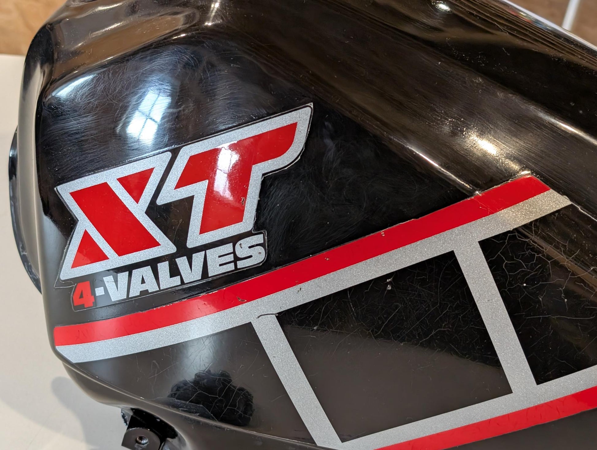 Yamaha XT600 43F Kraftstofftank mit Deckel schwarz gebraucht, in insgesamt altersgemäßem Zustand allerdings mit stärkeren Gebrauchs- bzw. Reparaturspuren. Der Tank wurde mal innenseitig beschichtet, zudem wurde er von außen zumindest stellenweise nachlackiert und auch mit Epoxid o.ä. abgedichtet, siehe hier im Bereich des Benzinhahns. Der Tank wurde ganz sicher stellenweise gespachtelt, ob die Aufkleber die Originalen sind ist nicht sicher. Zustand und Lackschäden bzw. Lackbild bitte den Bildern entnehmen.