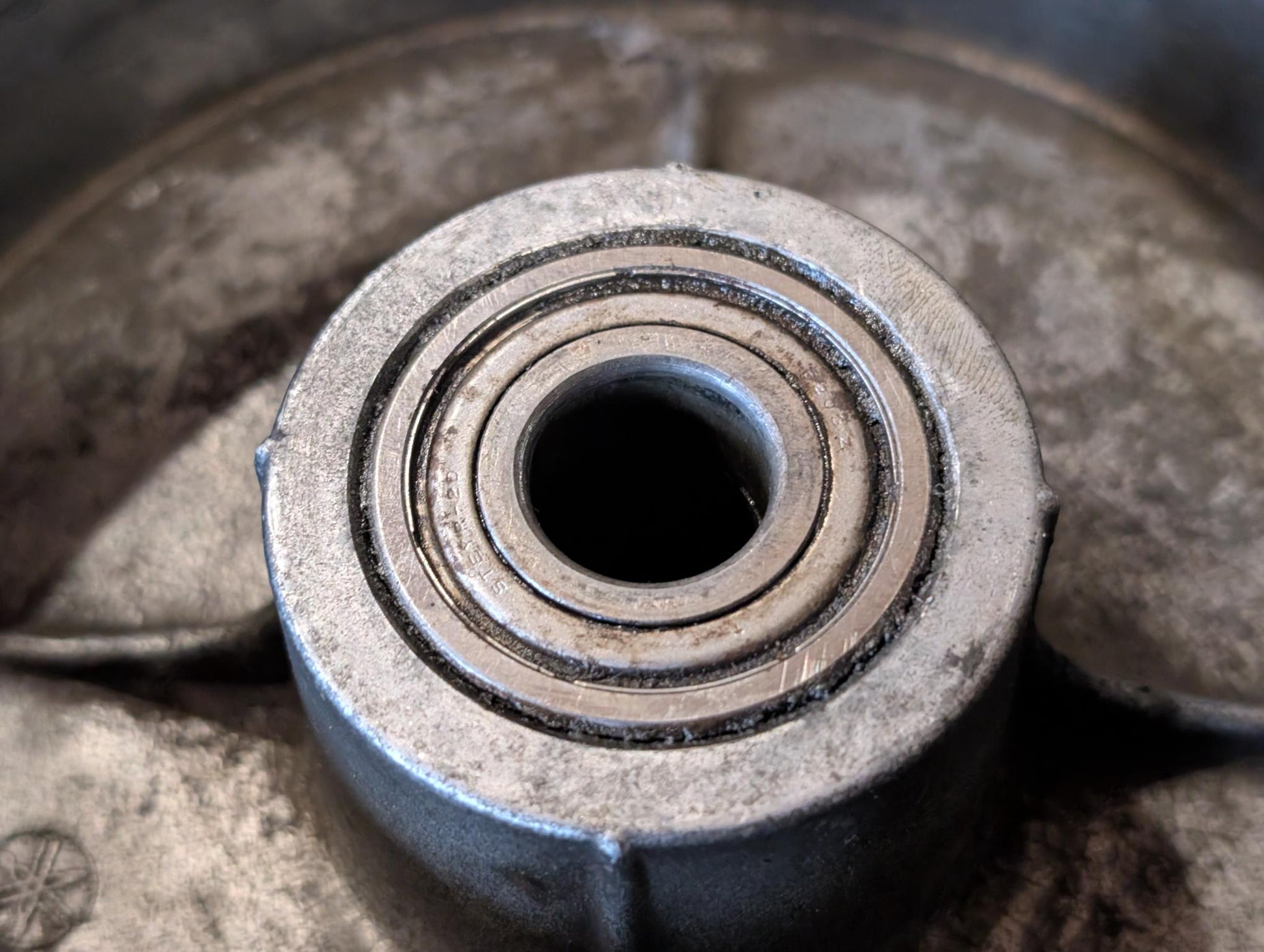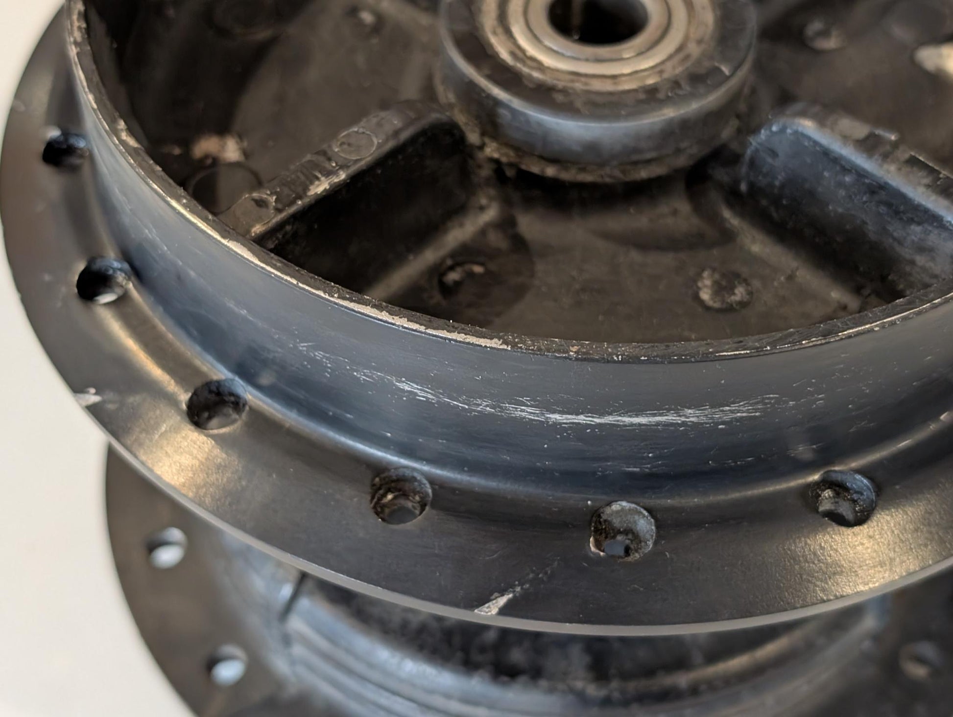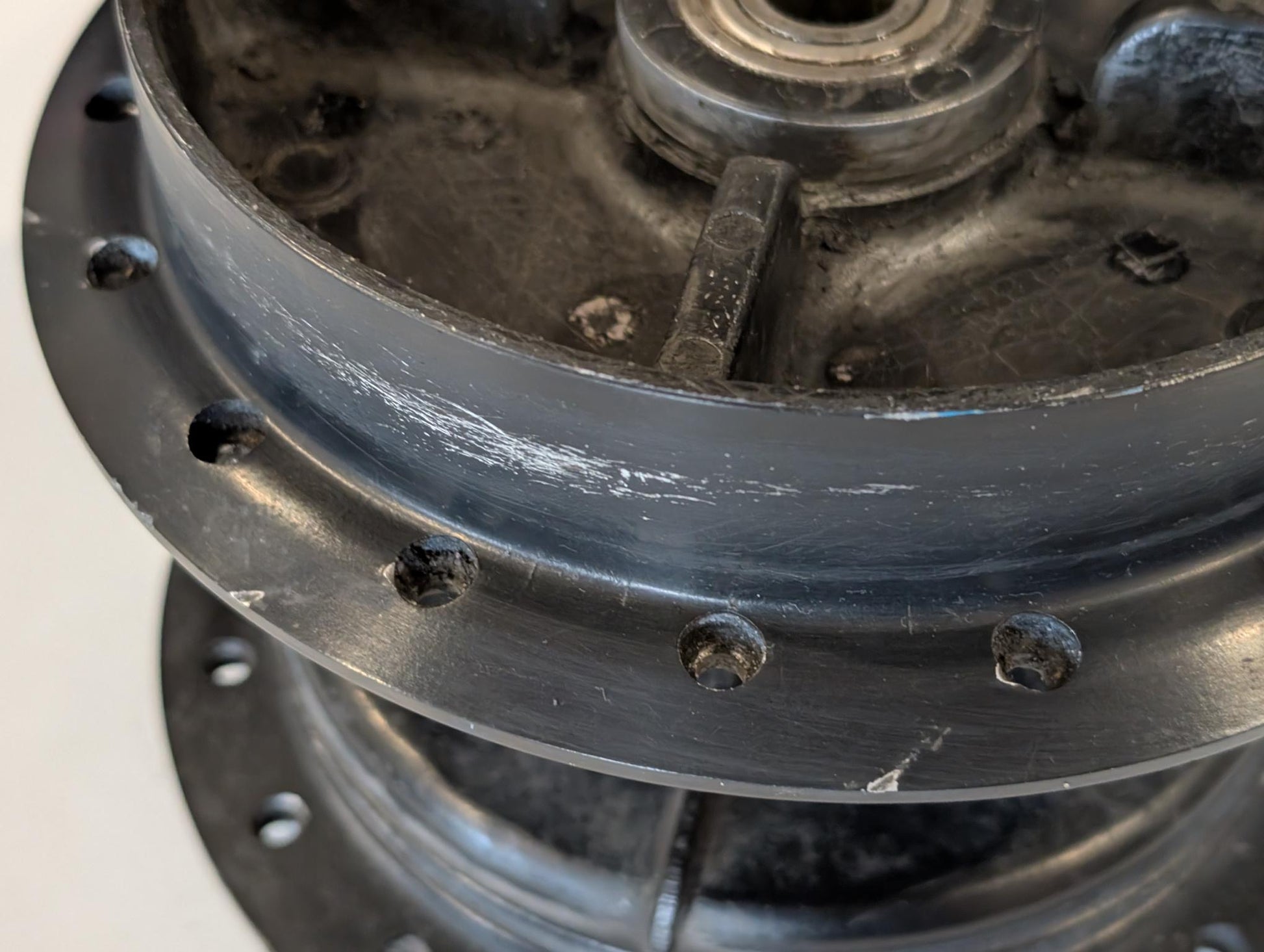 Yamaha XT600 43F Radnabe hinten Bremstrommel 5Y1-25311-00 gebraucht, in insgesamt gutem altersgemäßem Zustand, siehe Fotos. Bremsfläche noch in Ordnung, Lager fühlen sich gut an.