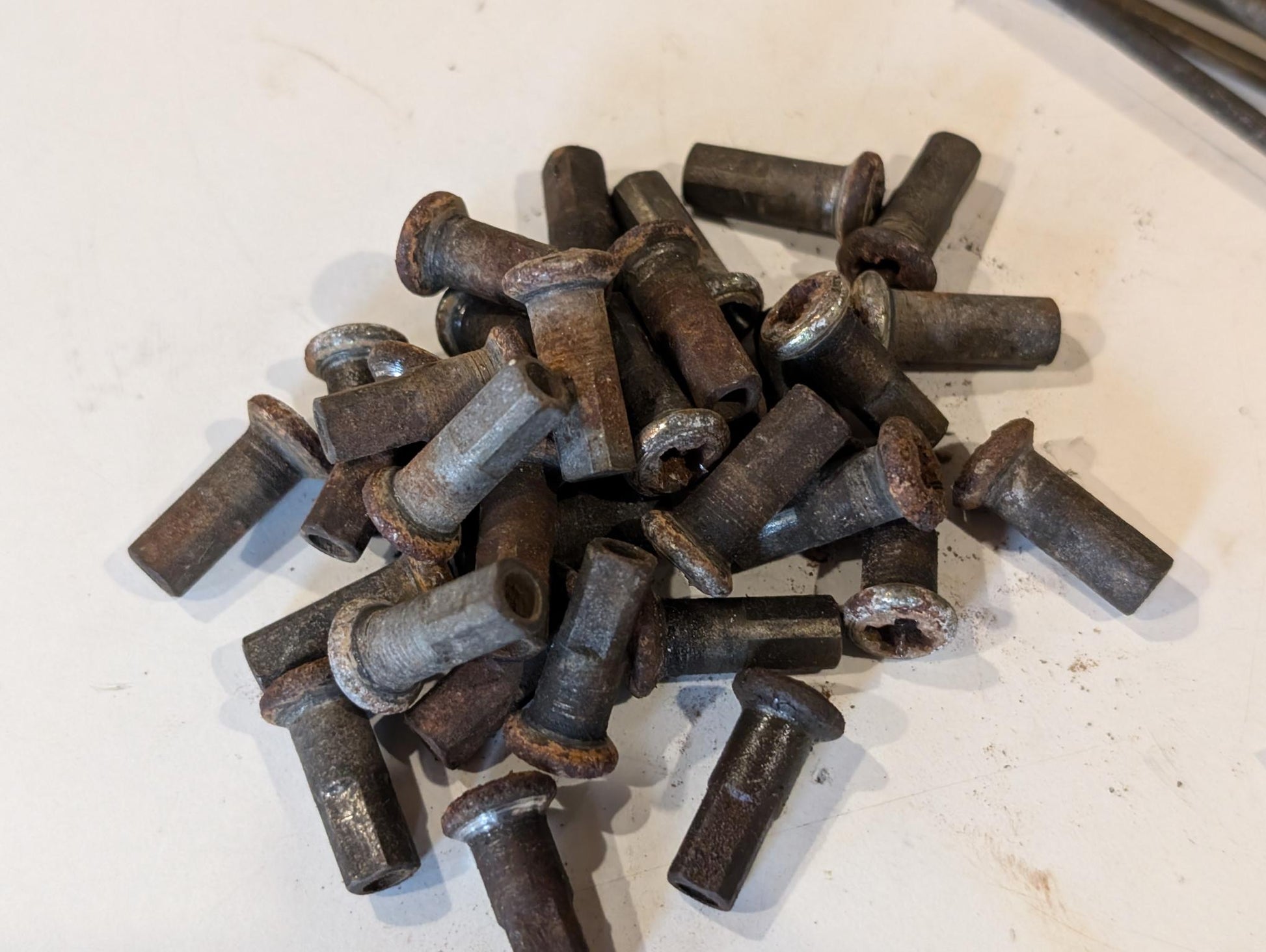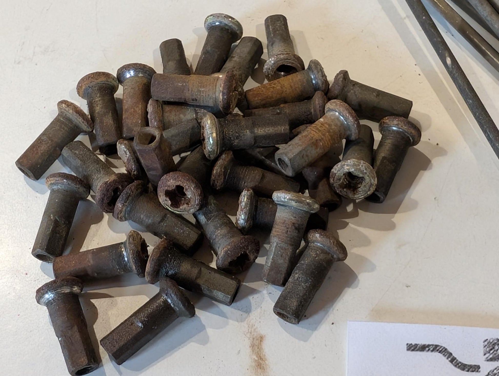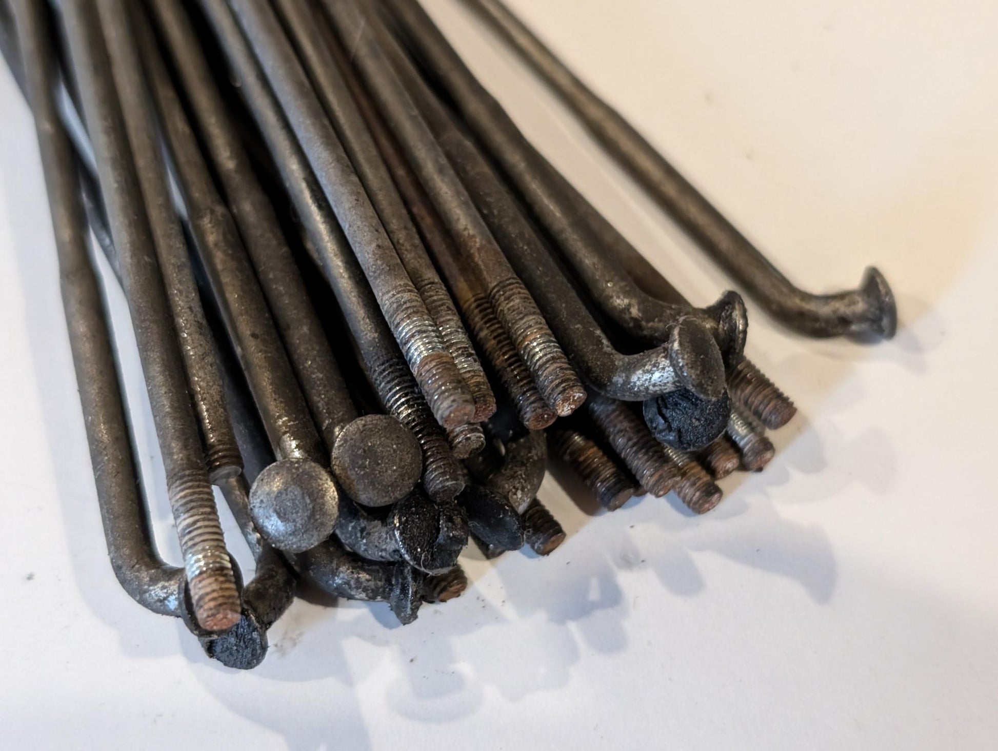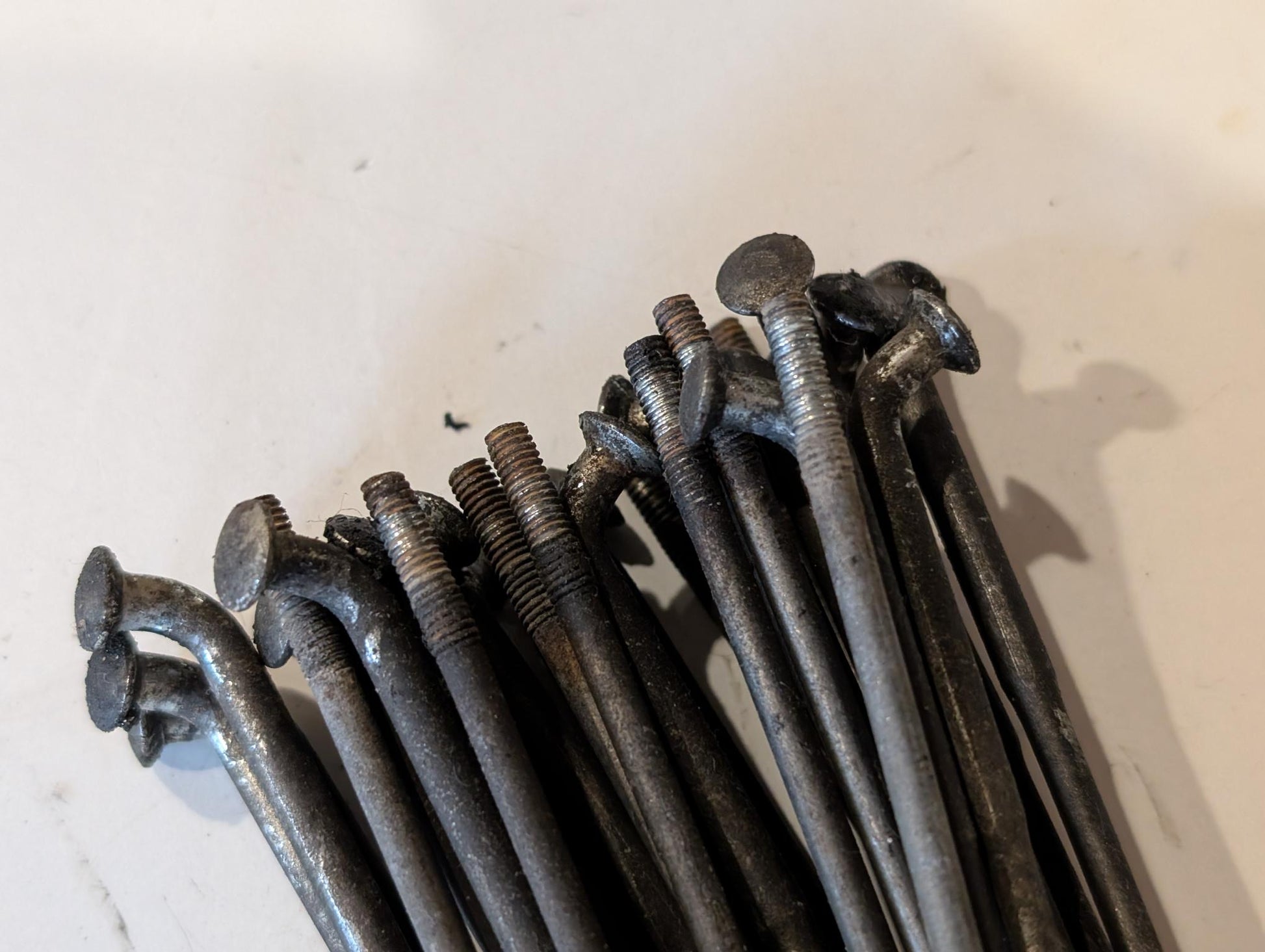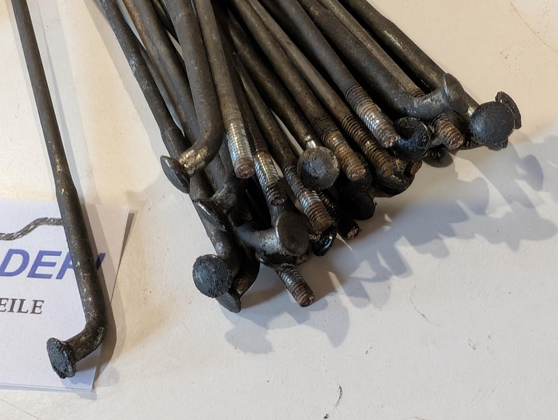 Yamaha XT600 43F Speichensatz unvollständig vorne, 31 Speichen 33 Nippel gebraucht, in altersgemäßem Zustand mit stärkeren Gebrauchsspuren, Kreuzschlitze weitestgehend verschlissen, Korrosionsansätze, Zustand siehe Fotos. War an einer Standard Vorderradnabe und einer Takasago Felge J21x1.60 aus 11/84 verschraubt, siehe letztes Bild.