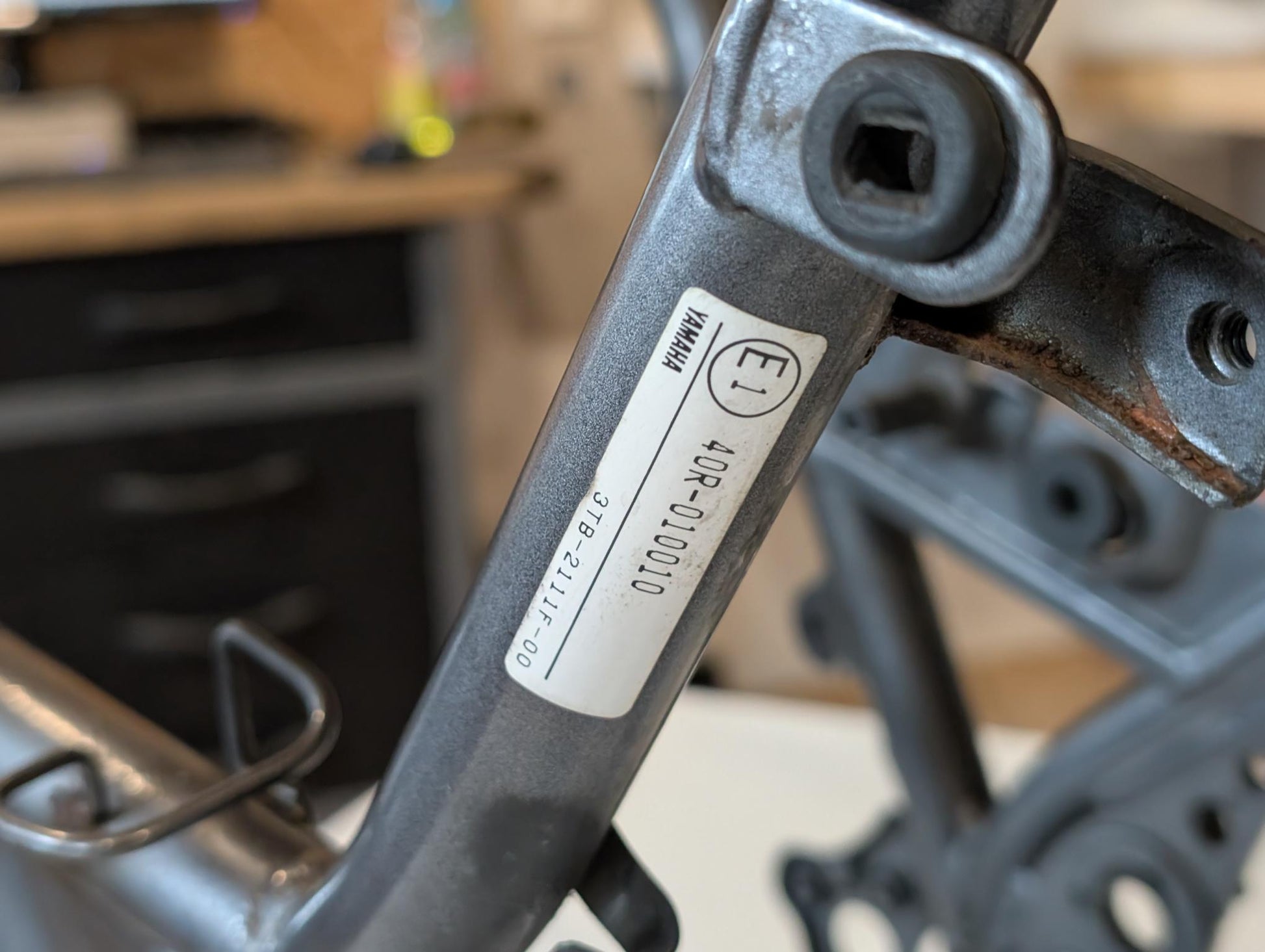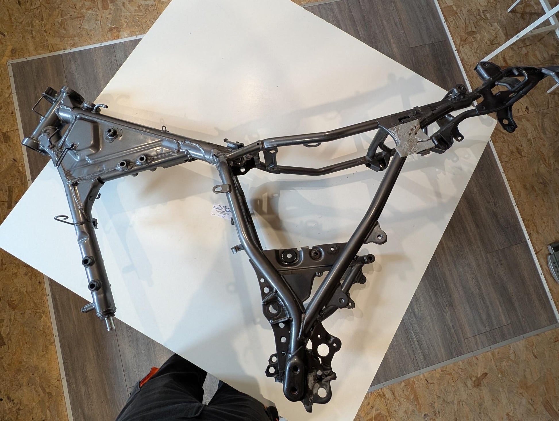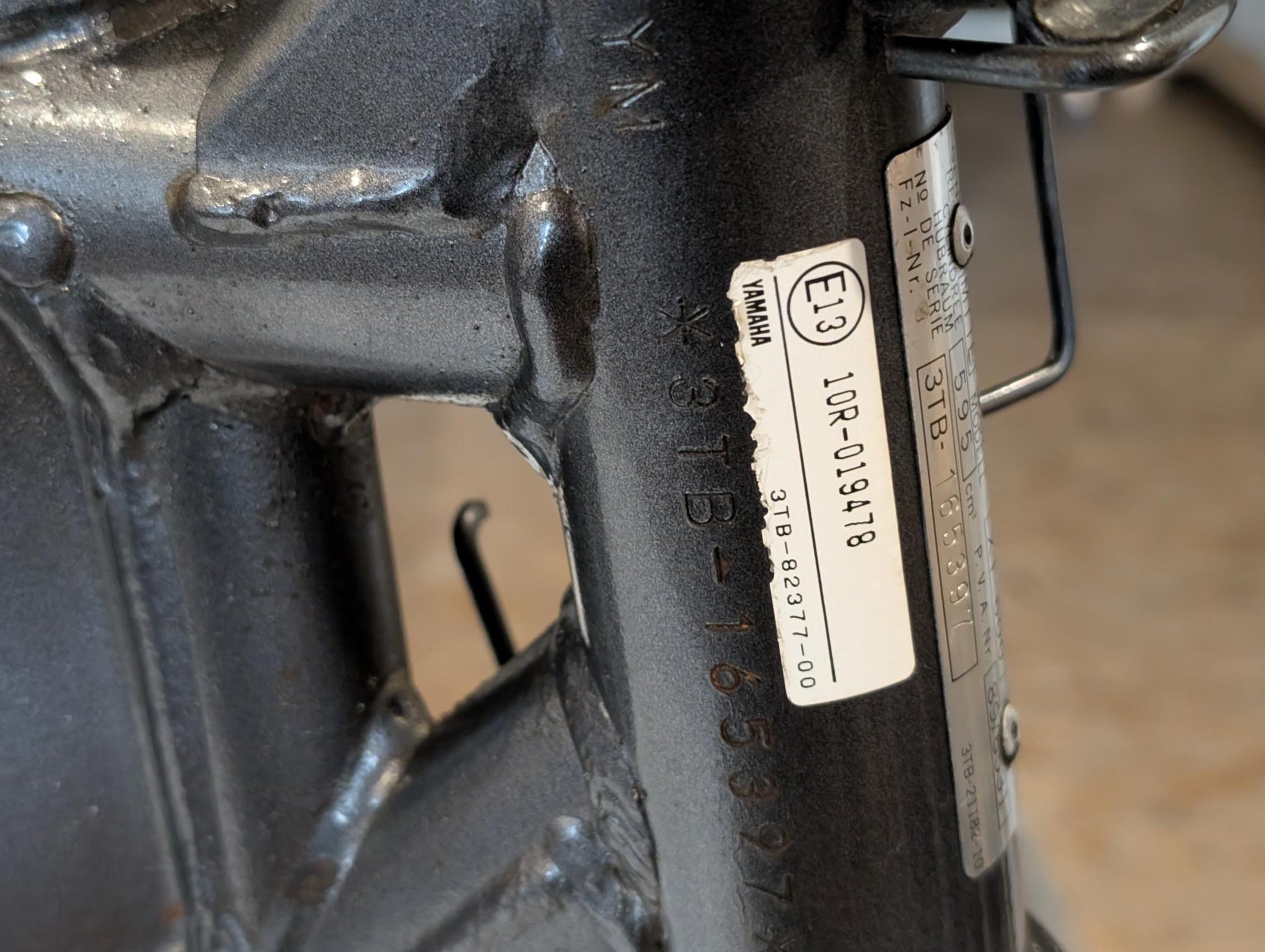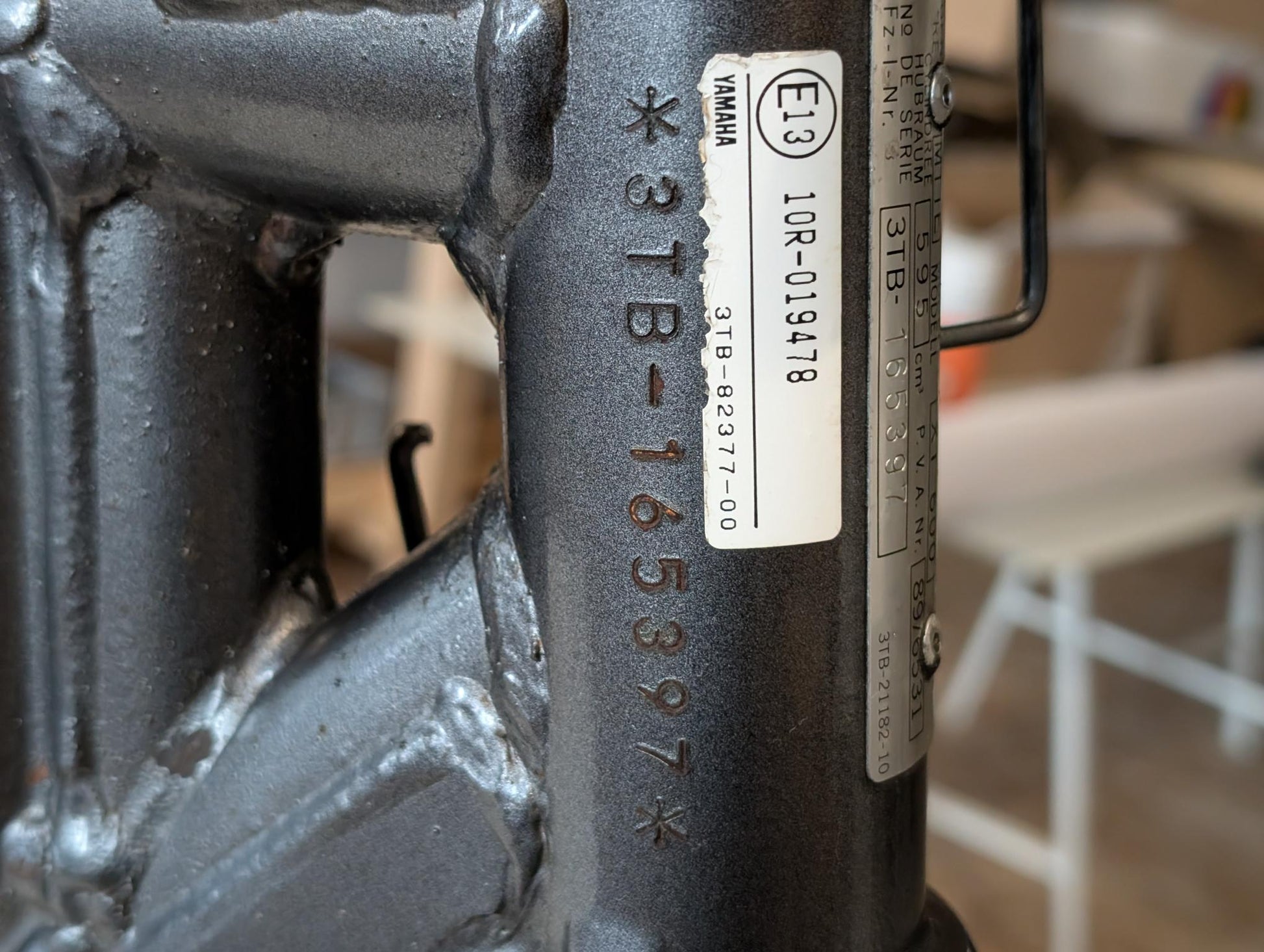 Yamaha XT600E 3TB 3UW Hauptrahmen grau metallic 3YP-21110-01 3TB-21182-10 gebraucht, in gutem altersgemäßem Zustand, mit Rostansätzen insbesondere in Schweißnahtbereichen, grob gereinigt so, dass ein Sandstrahler nicht meckern kann, Rahmennummer 3TB165397, Anzahl Vorhalter nach Unterlagen 6, Zustand und Lieferumfang siehe Fotos. Mit Briefen und Schein. Erstzulassung 09-1995. Erfahrungsgemäß werden Rahmen dieses Alters sandgestrahlt und neu lackiert oder pulverbeschichtet. Plakete vorher unbedingt sichern und nachher wieder annieten. Eingestanzte Rahmennummer muss nach Beschichtung sichtbar sein!